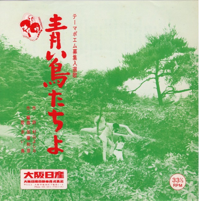 33回転/販促盤 盤質A ジャケットA- 大阪日産(株)/東芝音楽工業 ER-1265 「ラブリケーションwith大阪日産」キャンペーン・ソングとしてブルーバード新車発売展示会来場記念ノベルティとして配布されたもの。募集入選したポエムに加藤和彦が曲を付けたソフトロック・チューン。赤い鳥の澄み渡るコーラス・ワークをご堪能下さい。 「青い鳥たちよ」外部参考音源 https://youtu.be/vuJJeDd2mCU?list=RDvuJJeDd2mCU 【コンディション説明】 S : 新品同様 A : 美品 A- : 美品(僅かなスレ、小キズがある) B+: B : 普通の中古品(軽い傷やスレ、破れ、折れ、汚れ) B-: C : 全体的に傷やスレ、シミ、破れ、折れ、汚れがある D : 大きな傷やスレ、シミ、破れ、書き込み