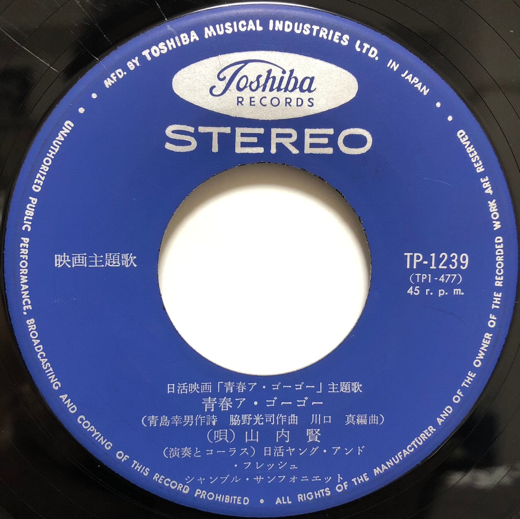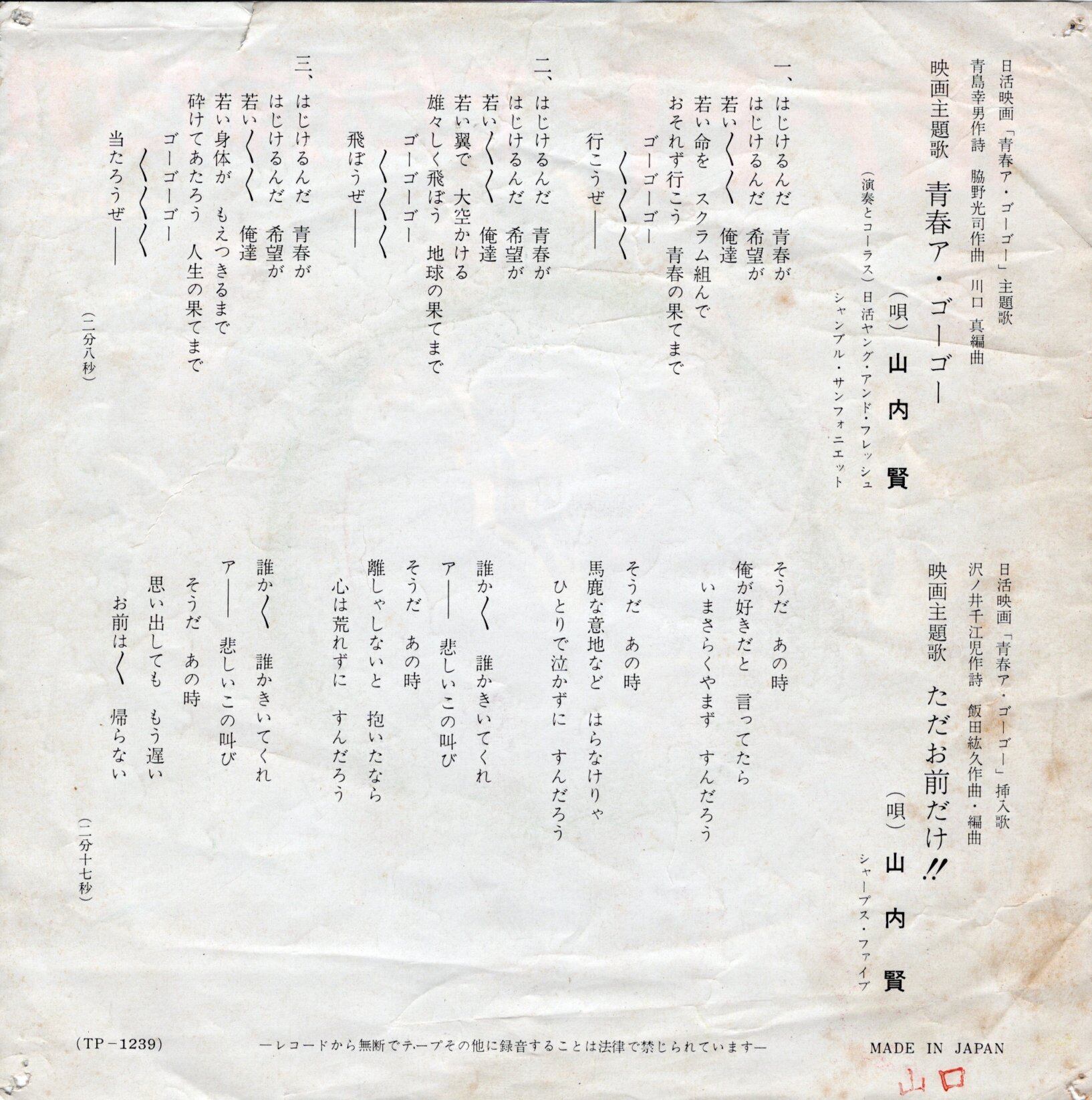 俳優山内賢と日活若手俳優によるエレキ・バンドの一枚。日活映画『青春ア・ゴーゴー』主題歌。A面はスパイダースとの競作にもなった溌剌エレキ歌謡。B面『ただお前だけ‼』はシャープ・ファイブをバックに歌う山内賢のソロ名義作品。