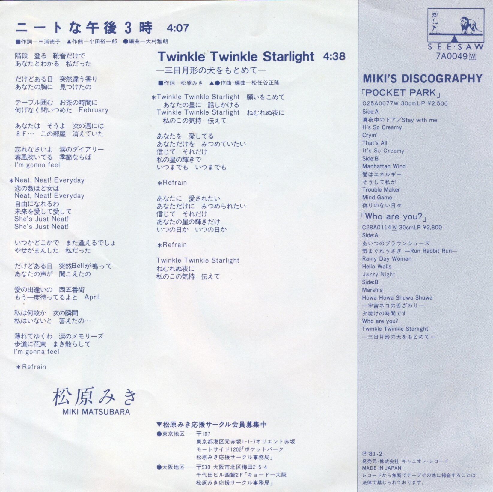 【7”】松原みき ニートな午後3時 / Twinkle Twinkle Starlight -三日月形の犬をもとめて-