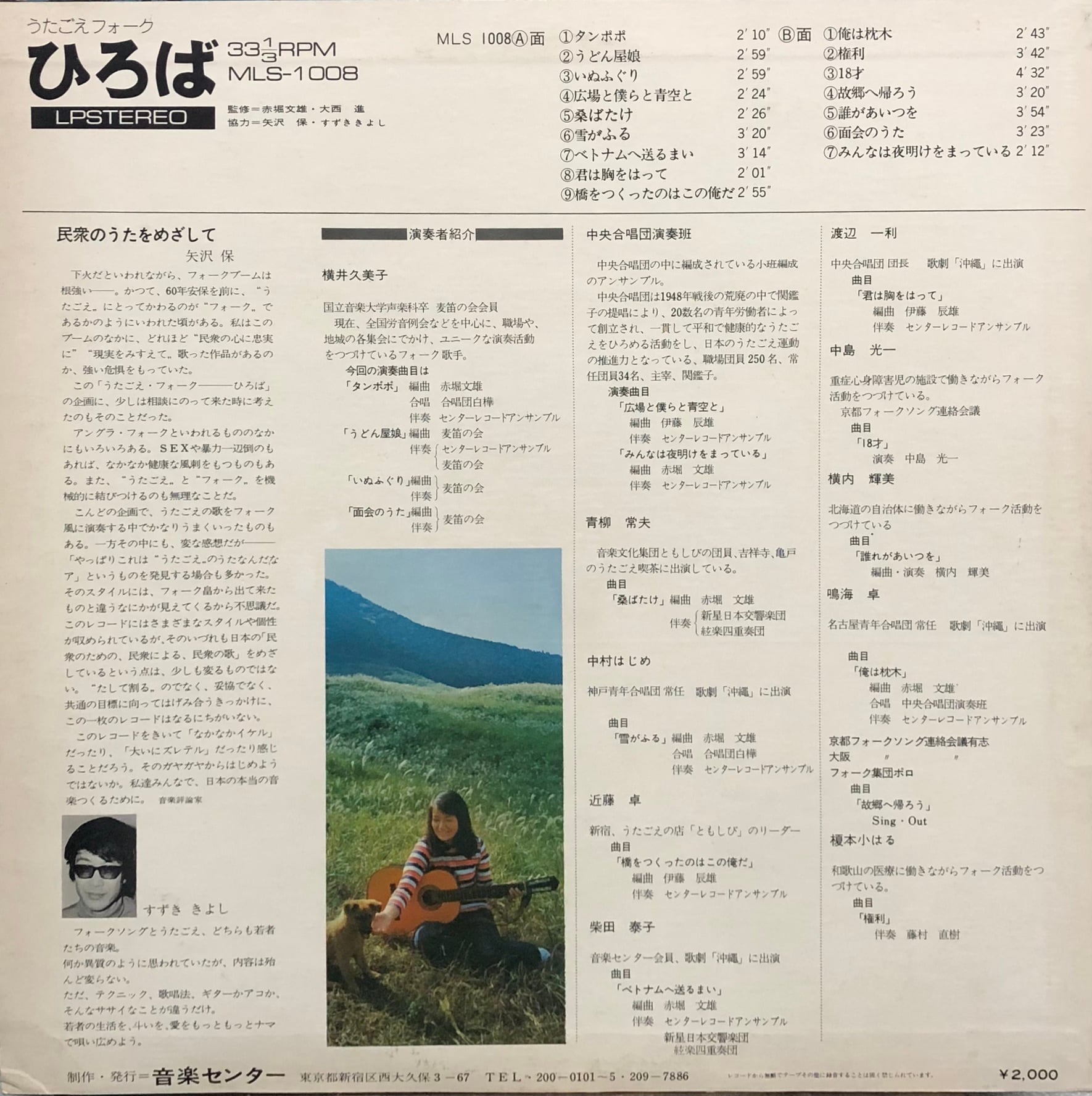 うたごえ運動 meets フォーク・ソング・アルバム。『私はしがない田舎のうどん屋娘』とのパンチラインが軽快に歌われるサビとオルガン・ソロがたまらないフォーク・ロックなA2、合唱団系ソフトロックA4、B7、ブルージィなベースラインがグルーヴィなロッキン(六勤?)労働歌B1等々聴きどころ満載。戦後日本の思想史をホークで記録した一枚。