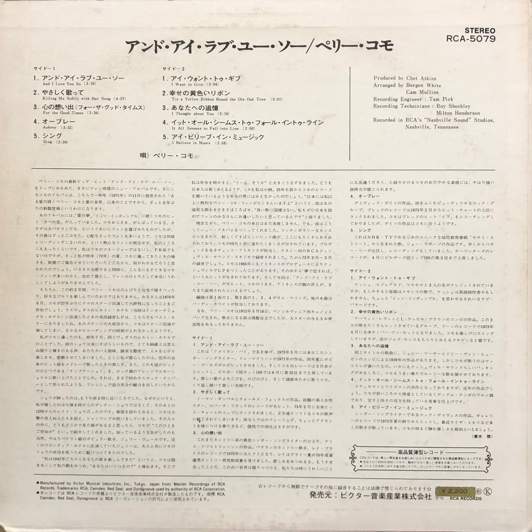 ビング・クロスビー、フランク・シナトラと並び20世紀を代表するポピュラー・シンガー、ペリー・コモ、’73年リリースのアルバム。クリス・クリストファーソン(A3)やカーペンターズ(A5)、デヴィッド・ゲイツ等、当代ヒット・ナンバーをジェントルかつウォームに歌いあげた一枚。グルーヴィ―なB5も’70年代らしいサウンドのコモが楽しめます。