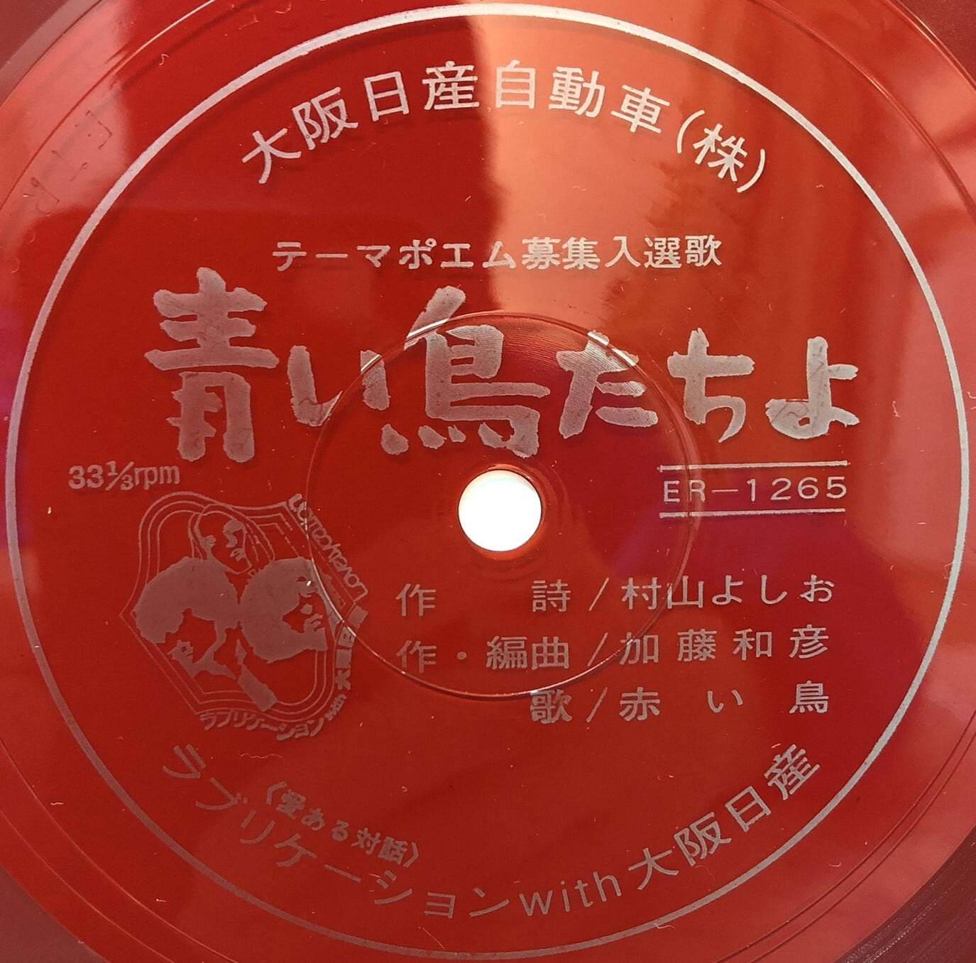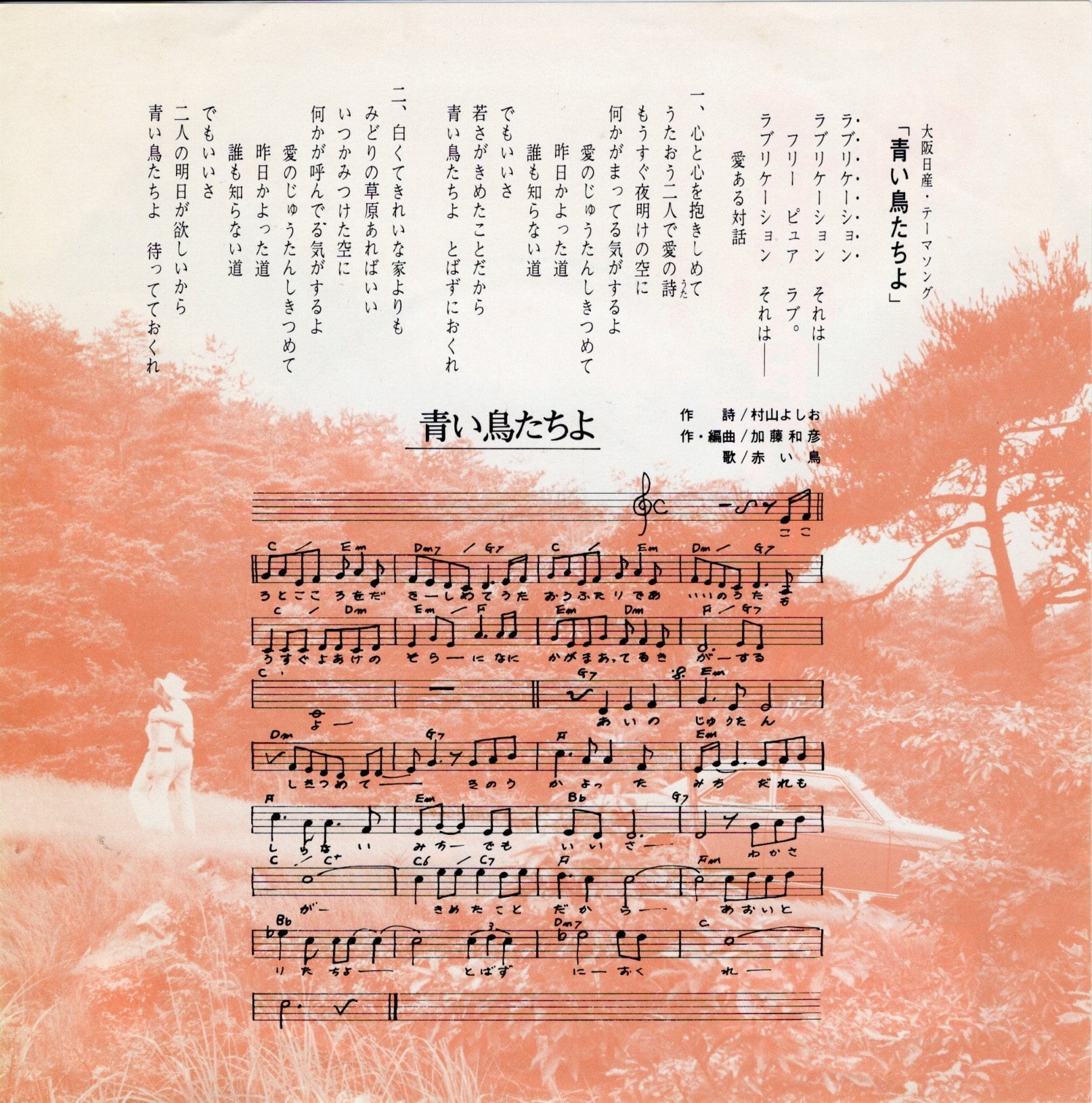 「ラブリケーションwith大阪日産」キャンペーン・ソングとしてブルーバード新車発売展示会来場記念ノベルティとして配布されたもの。募集入選したポエムに加藤和彦が曲を付けたソフトロック・チューン。赤い鳥の澄み渡るコーラス・ワークをご堪能下さい。