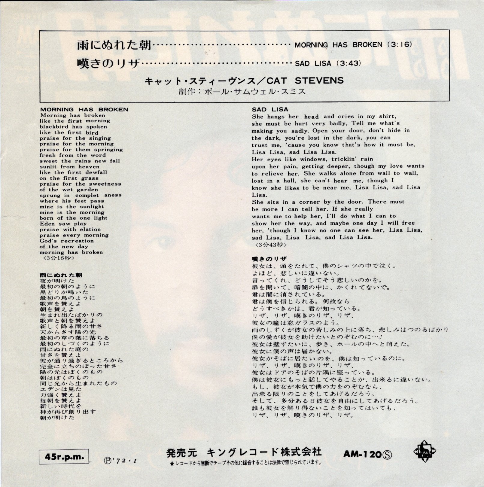 【7”】キャット・スティーヴンス 雨にぬれた朝 / 嘆きのモナリザ Cat Stevens – Morning Has Broken / Sad Lisa | VINYL SHOP shiosairec