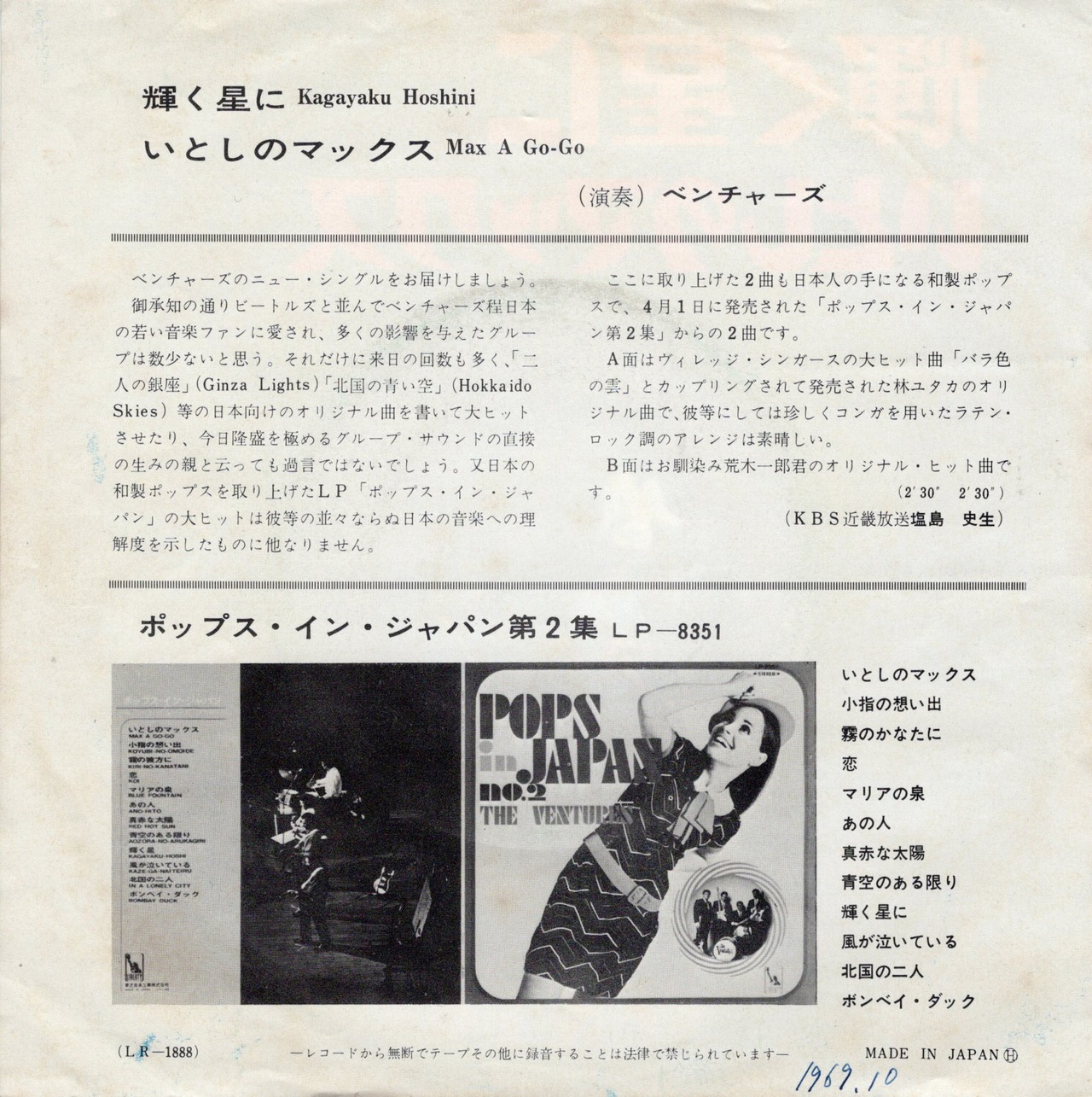 ’68年リリースのアルバム『ポップス・イン・ジャパン第2集』からのカット。ヴィレッジ・シンガーズのヒット(A面)に荒木一郎の代表曲をカップリング。