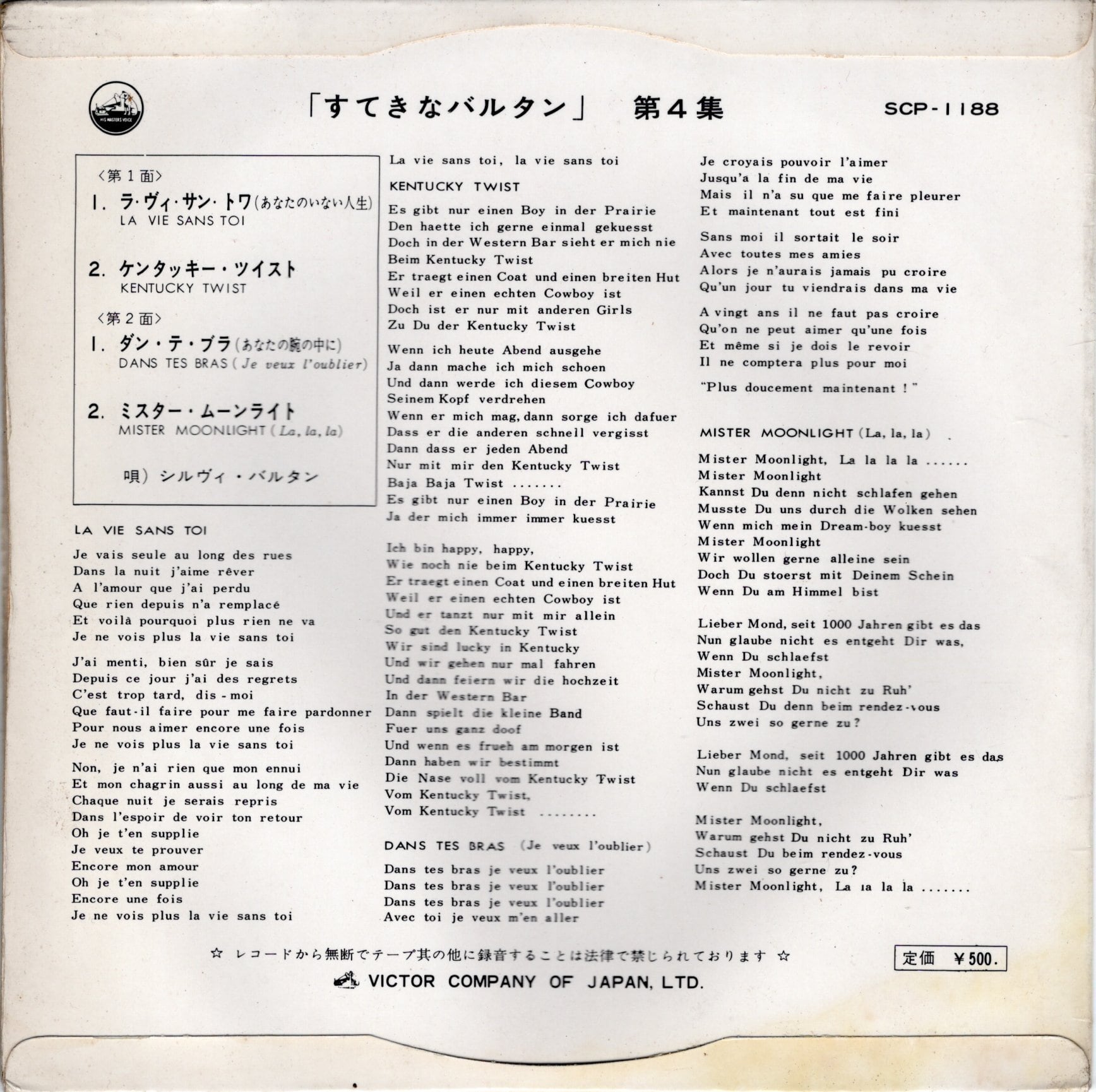 ’65年リリース。イェイェ(フレンチ・ポップス)の女王シルヴィ・バルタン厳選4曲入りコンパクト盤。アルバム『あなたのアイドル』からの2曲に本邦未発売2曲(A2、B2)を足した日本独自盤。