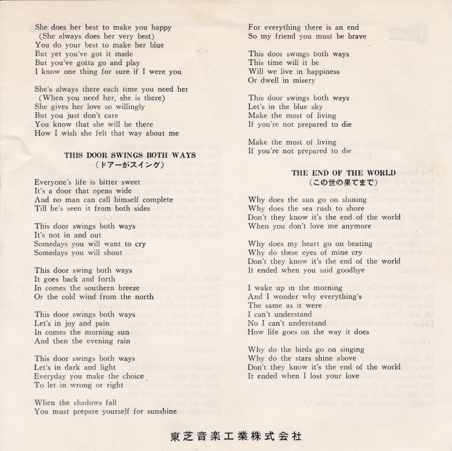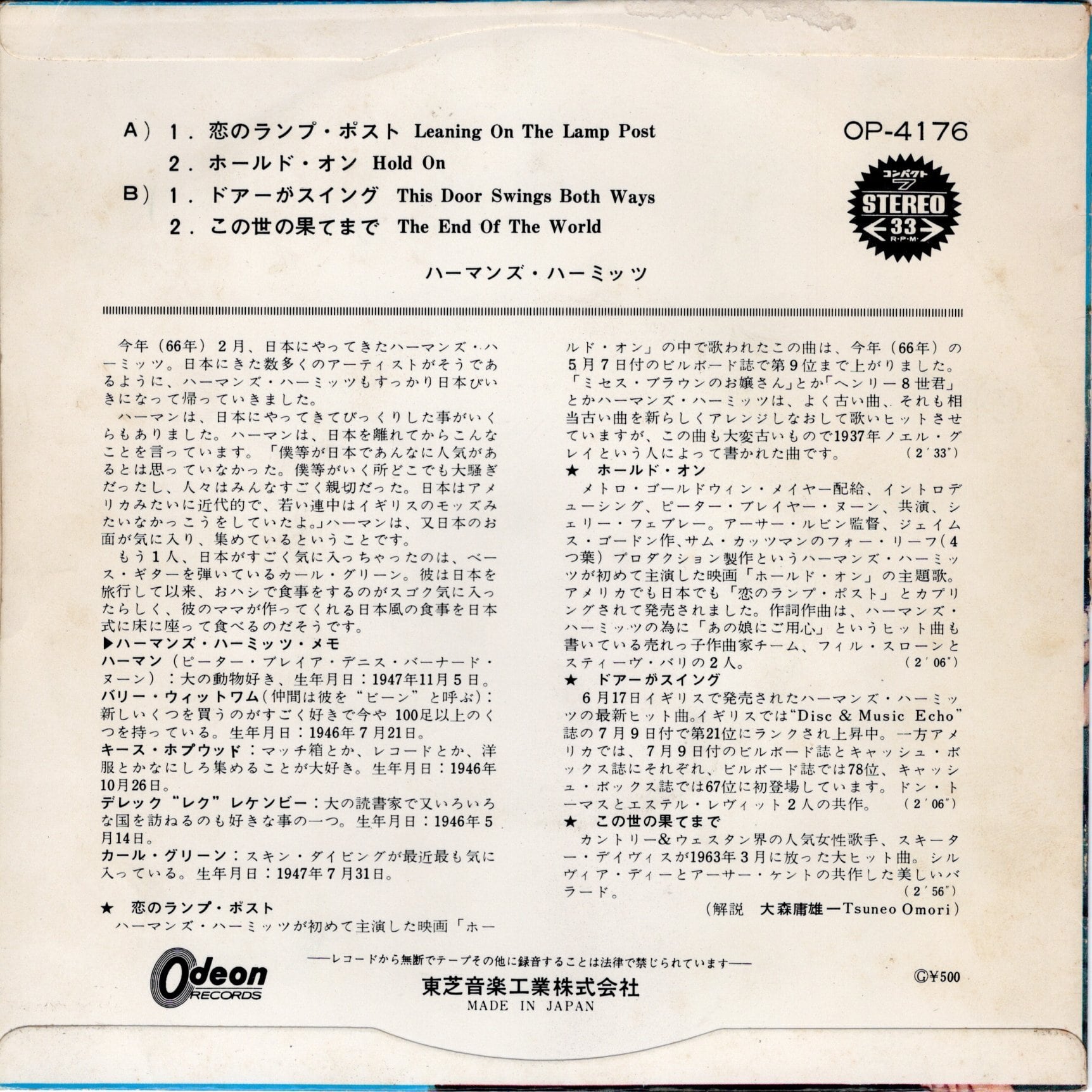 ’66年発売。ハーマンズ・ハーミッツ厳選4曲入りコンパクト盤。主演映画『ホールド・オン』から2曲(A1.A2.)を収録。