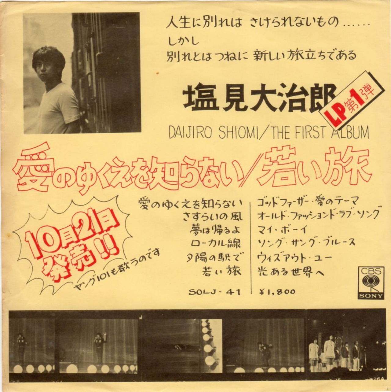 1970年放送開始のNHKの歌番組「ステージ101」において番組内のコーラスグループ"ヤング101"の主要メンバー“ダイちゃん”こと塩見大治郎のソロ・シングル。A面「愛のゆくえを知らない」は男・大治郎が歌う恋の別れを描いた哀愁歌謡なんですが彼女をアパートに置き去りにして早朝の汽車でどこかへ消えていく完全なる蒸発スタイルでの別れです。B面「夕陽の駅で」は長調(メジャー)→短調(マイナー)を行き来する旅情歌謡。暗いんだか明るいんだか。重いんだか軽いんだか。泣いていいのか笑っていいのか。揺れ動く男心(ひょっとしてA面の蒸発男と同じキャラクターか?)を描いたような作品。とにかく“旅情ダブルサイダー”と呼びたい一枚ですね。ちなみにソロ・アルバムからの先行カットだったようでアルバム・プロモーション用のフライヤー(写真参照)も封入されております。ぜひヤング101内の人気メンバー、ダイちゃんの旅路を味わってください。