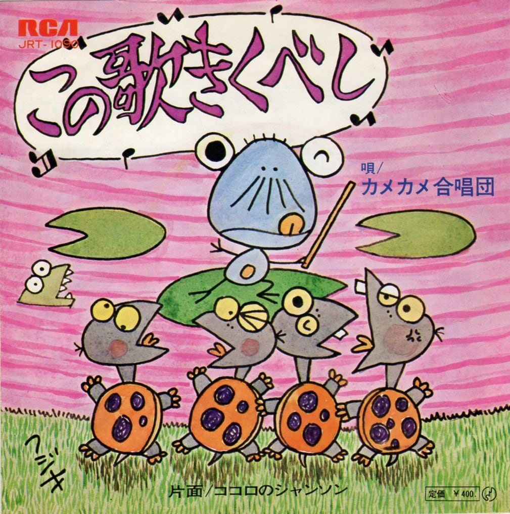 1970年発売。ニッポン放送のDJ亀渕昭信と泉谷しげるによるユニット「カメカメ合唱団」歌う赤塚不二夫原作漫画「もーれつア太郎」登場キャラクターのイメージ・ソング7inch。両面共に原作者赤塚不二夫による作詞。A面「この歌きくべし」は蛙キャラの「べし」をイメージしたもので三味線リフや講談調メロにソウルフルなホーンが絡む面白R&B歌謡。作曲は葵まさひこ。実にエエ湯加減な仕上がりになっております。そしてB面「ココロのシャンソン」は犬人間(?)キャラ「ココロのボス」をイメージしたスキャット入りフォーキー・ソフトロック。どこか聴きなじみのあるメロディーはトノバンこと加藤和彦のペンによるもの。両面ともに元ハプニングス・フォーのクニ河内編曲によるファニーでメルヘン味ある楽曲となっております。この機会に是非!