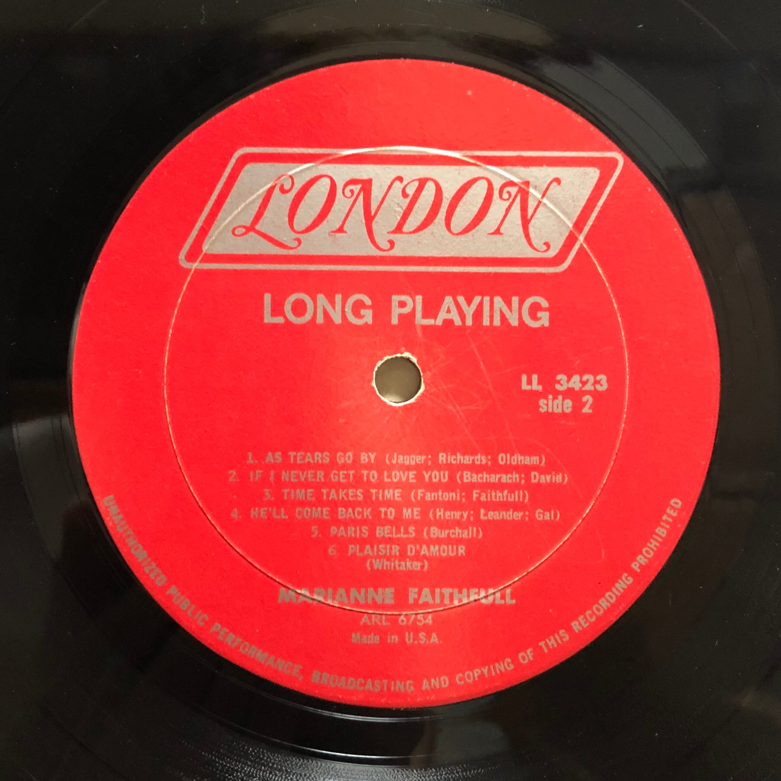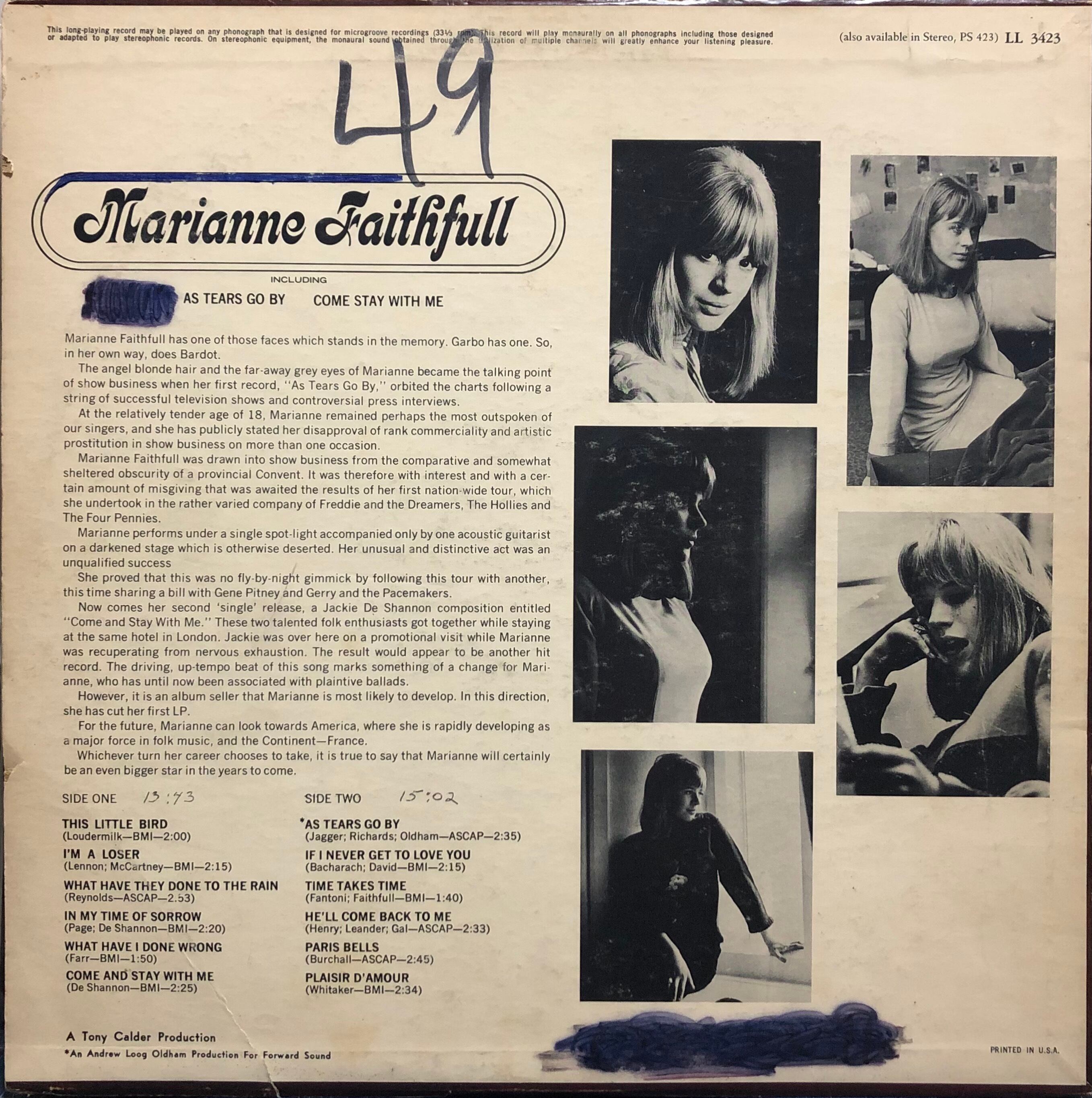 1965年リリース。60年代のミック・ジャガーのガール・フレンドであり、清純派アイドルだった頃の彼女のUS盤アルバム。天使の歌声と呼ばれた(後に色々諸々あって声変わりします)彼女らしくフォークやクラシカル・ポップな色合いに満ちたアルバムとなっております。オススメはビートルズ・カバーの(A2)と彼女の為に作られたジャガー/リチャーズ作品(B1)でありましょうか。