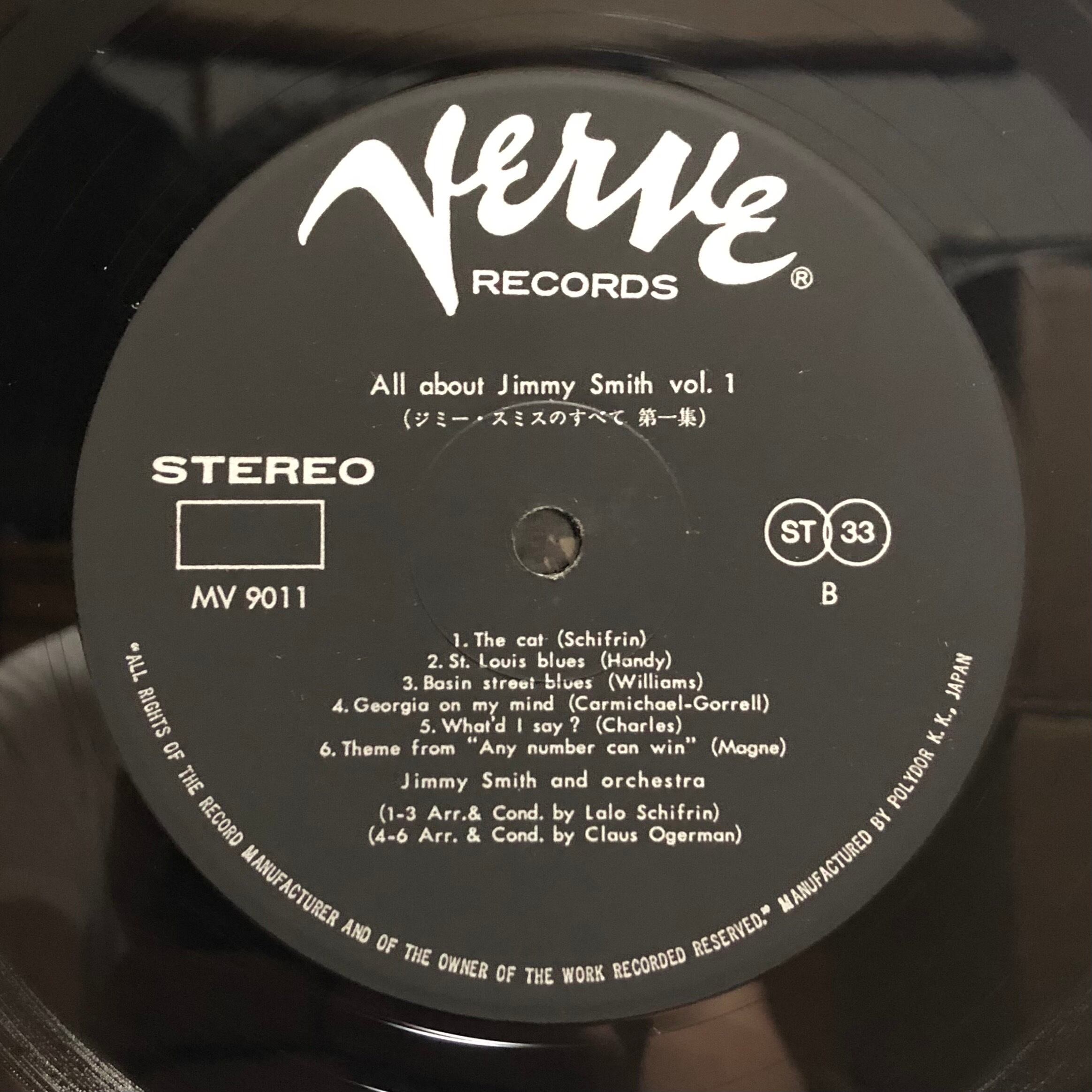 天才的インプロビゼーション・スタイルでジャズ・オルガニストの花形奏者となったジミー・スミスの日本独自編集盤。VERVE在籍期音源の中からビッグバンドとの共演やトリオ演奏等を厳選。今やMOD JAZZ~クール・シネマ・インストの定番となった「THE CAT」(B1)や「ORGAN GRINDER’S SWING」(A3)など収録。