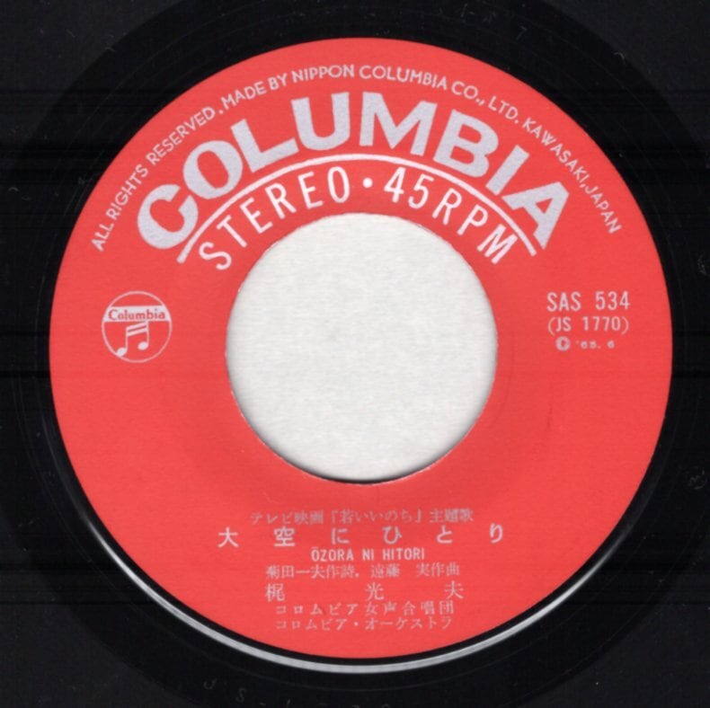 ’65年6月発売。大阪の有名宝石店御曹司であり遠藤実門下生でもある梶光夫が主演も務めた青年将校を描いたドラマ「若いいのち」主題歌。A面「若いいのち」はドラマ原作者、菊田一夫による作詞と古関裕而作曲による「同期の桜」的バンカラ作品。B面「大空にひとり」は同じく菊田一夫作詞・遠藤実作曲によるを海軍飛行兵を悼む歌詞。二度と繰り返してはならない戦争への思いが込められている作品。