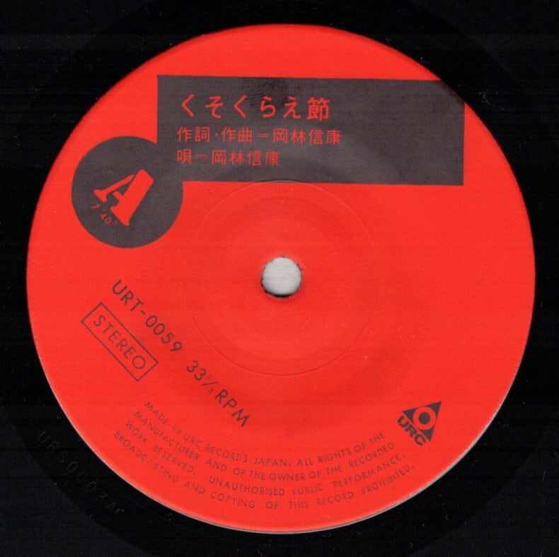 ’71年7月リイシュー(オリジナルは’69年8月リリース)。A面は元々ビクターで歌詞やタイトルまで変え見本盤まで作られたのに結局発売禁止になった「ほんじゃまあおじゃまします」のオリジナル・リリック版。リリースまでにすったもんだでいわくだらけ(詳細は割愛。ウィキペディアをご覧ください)の歌ですが晴れてURCよりこちらの盤で陽の目を見る事になりました。実況録音で岡林のあけすけで飄々とした歌唱とウィットに富んだ客いじりの才に惚れ惚れします。そしてB面「がいこつの唄」もA面以上にいわくだらけだそうですが、それよりも作品の素晴らしさと岡林のパフォーマンスにA面同様感動させられてしまいます。曲が長い(A面7分強)ので両面とも33⅓RPMで収録されておりますがまったく長さを感じさせないってのはすごいなぁ。