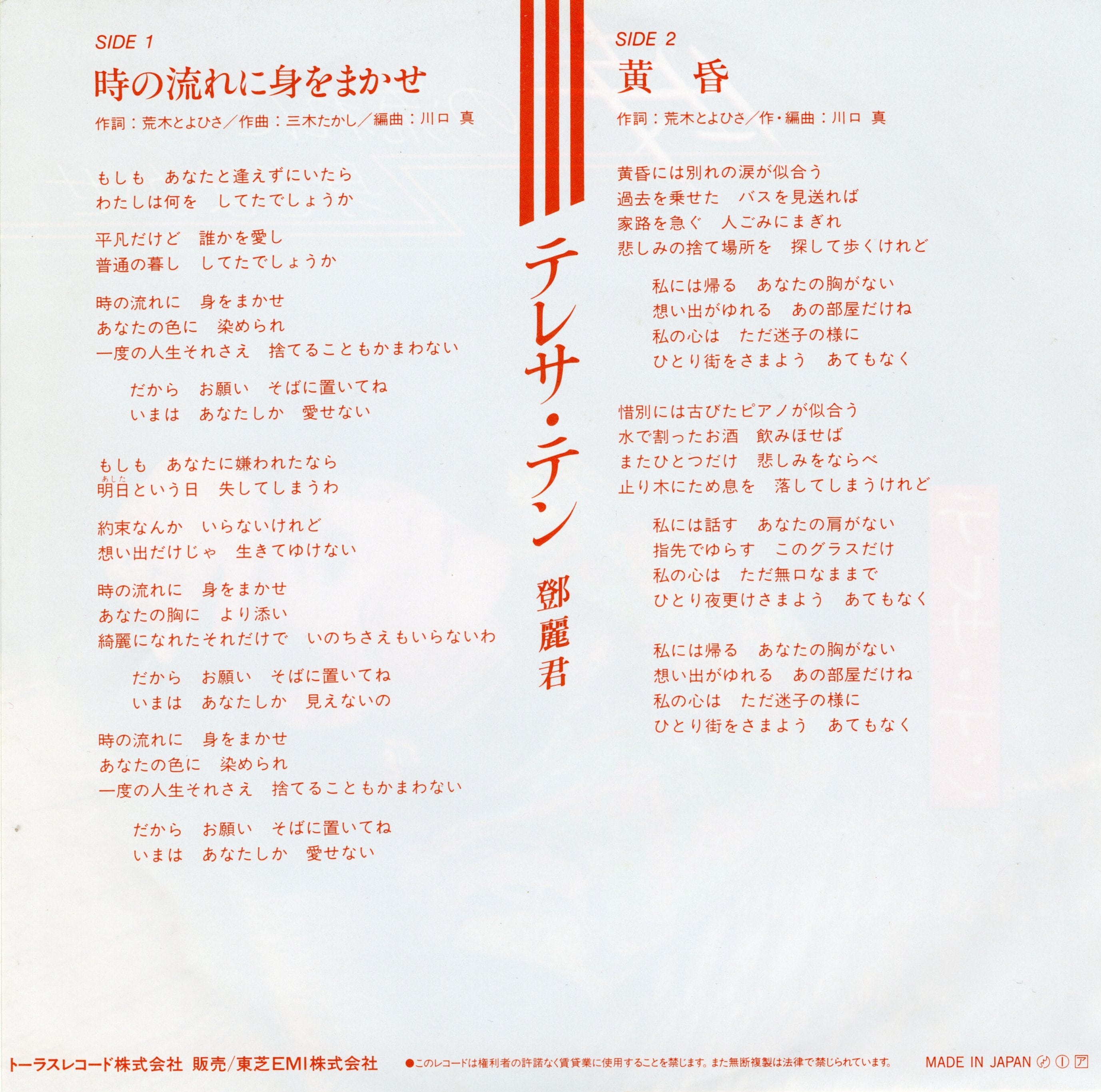 ’86年発売オリジナル盤。日本再デビュー後、破竹の勢いでヒットを飛ばしていたテレサ・テンの代表曲。前作「つぐない」「愛人」に続き、作詞・荒木とよひさ、作曲・三木たかしのコンビ作品。