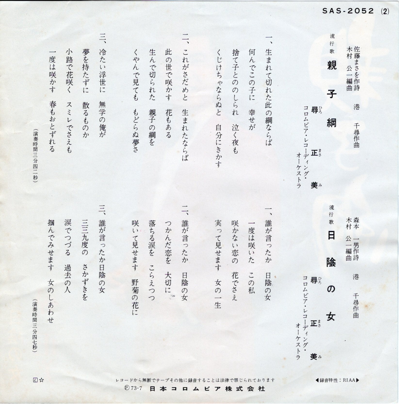 ’73年発売。A面「親子綱」はメロウ演歌。B面「日陰の女」が3連リズムのブルージィ・ムード歌謡。ディープなナイト・モードにどうぞ。