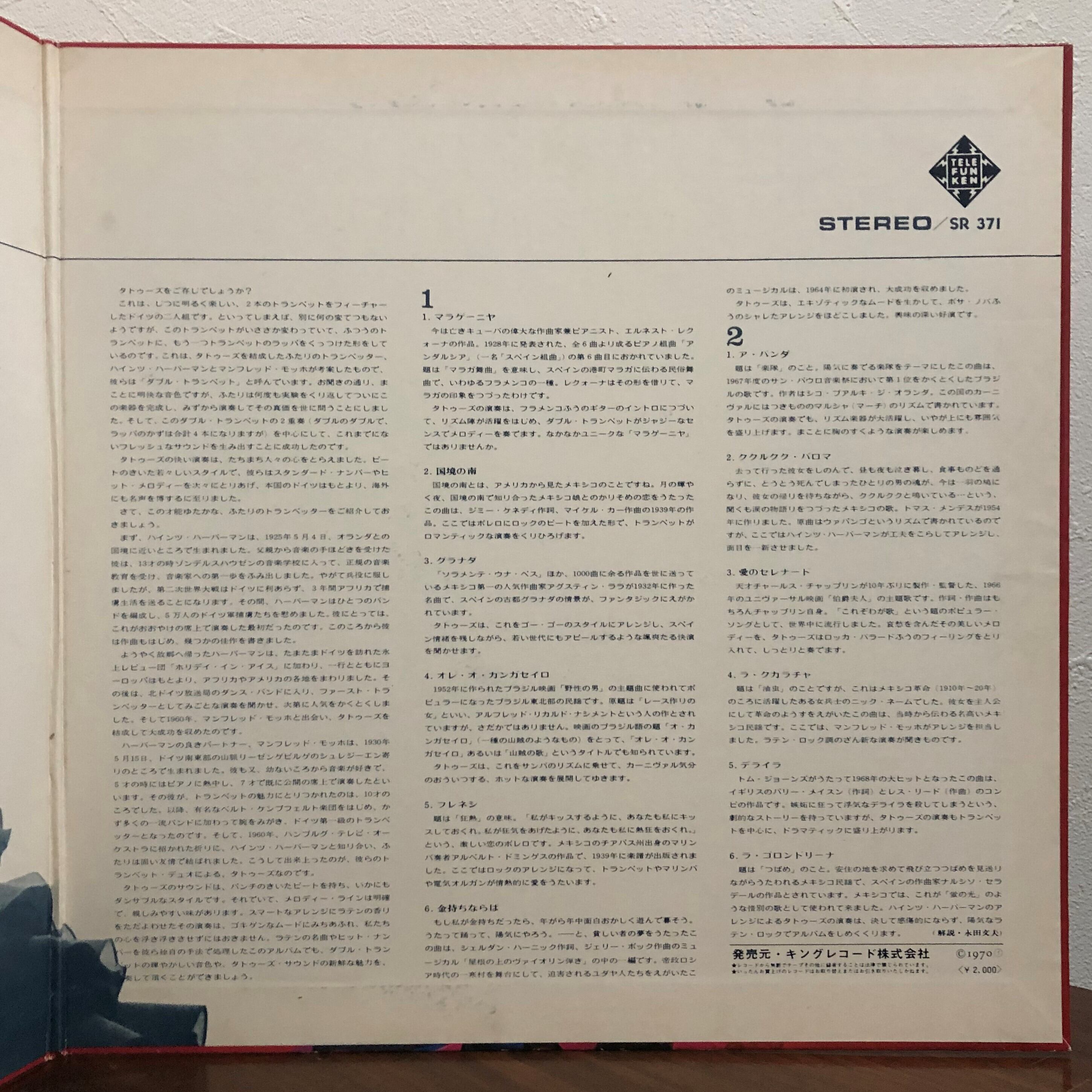 旧・西ドイツのトランペット・デュオ "The Tattoos" ’70年国内オリジナル企画盤(’68年リリース・アルバム "Party-Pops" と "Latin Pops" からの編集)。ビートの効いたアレンジにダブル・トランペット・サウンドがフィーチャーされたダンサブル・ラテン・アルバムとなっております。