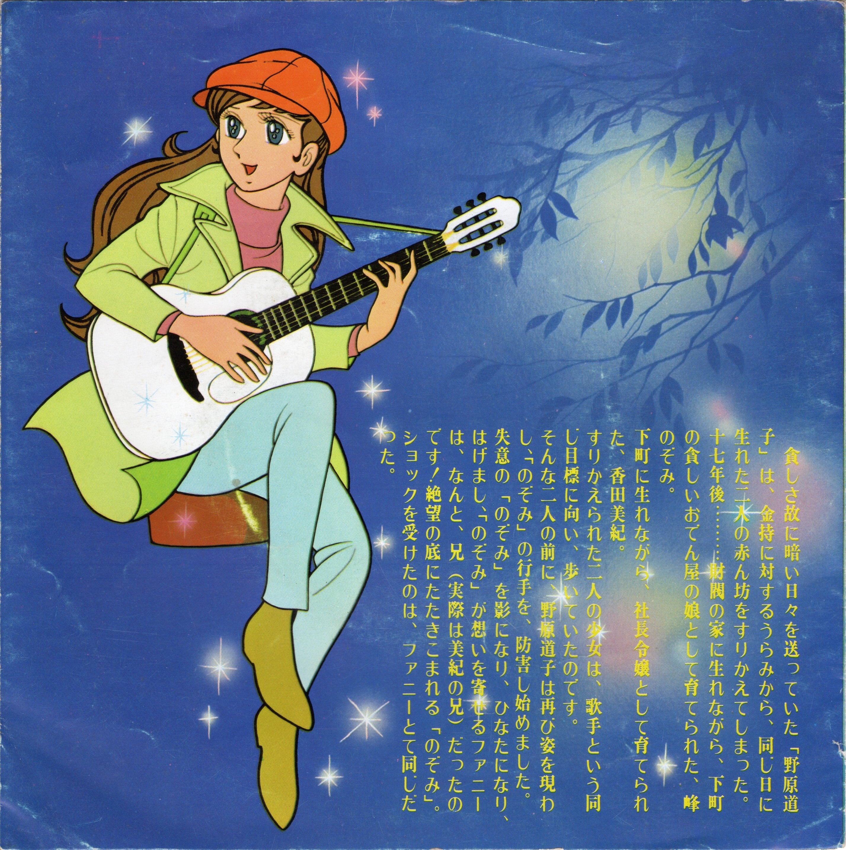 ’71年5月発売。テレビアニメ「さすらいの太陽」主題歌。SIDE1はスリー・グレイセスとボーカル・ショップによるソフト・ロック歌謡。SIDE2は劇中でもキーとなる作品(堀江美都子・歌唱)。