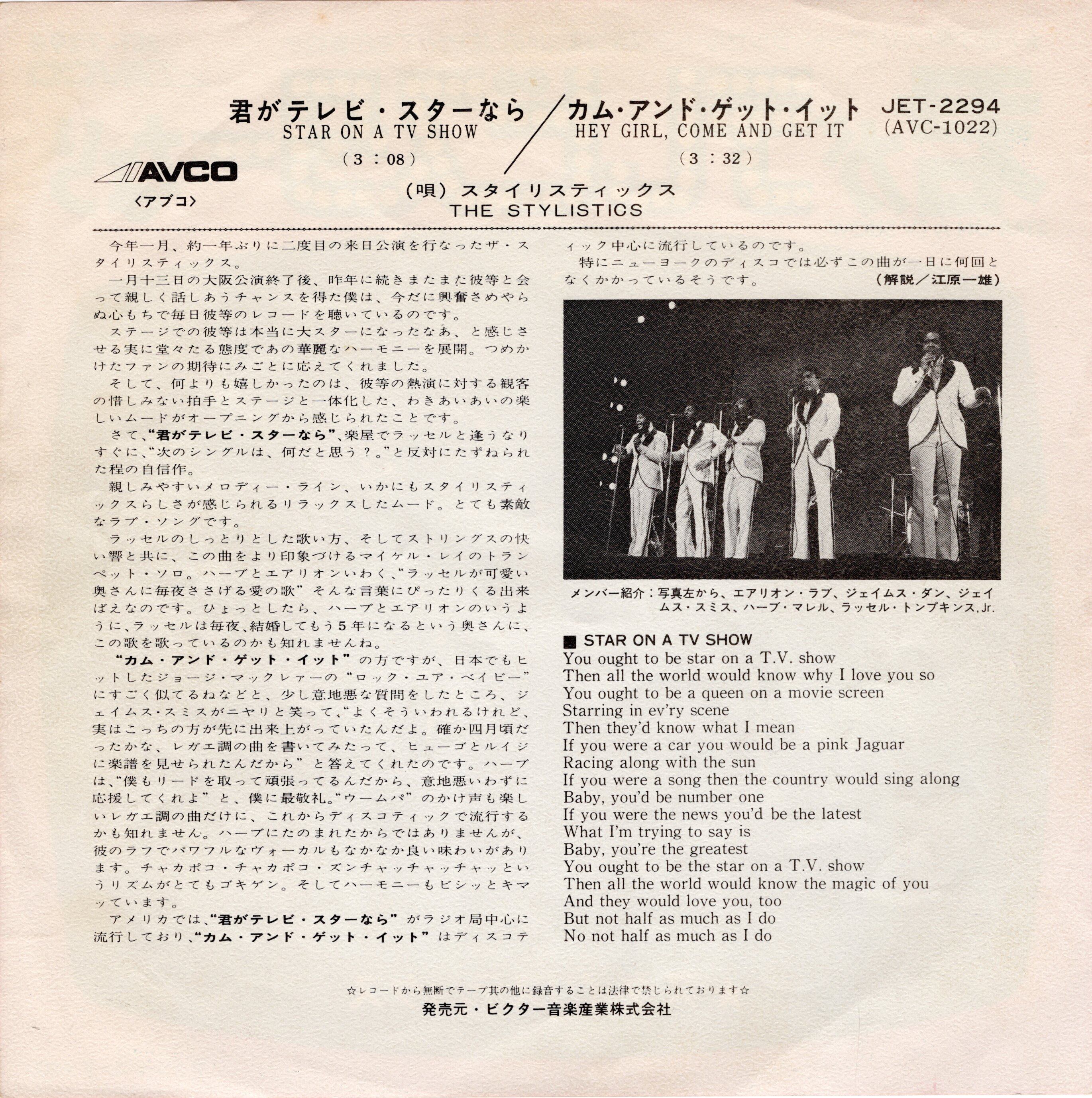 【7″】スタイリスティックス 君がテレビスターなら / カム・アンド・ゲット・イット The Stylistics – Star On A TV Show / Hey Girl Come And Get It