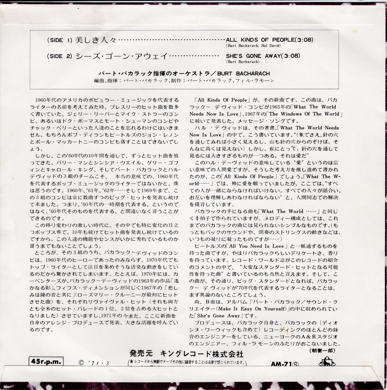 【7″】バート・バカラック指揮のオーケストラ 美しき人々 / シーズ・ゴーン・アウェイ Burt Bacharach – All Kinds Of People / She's Gone Away