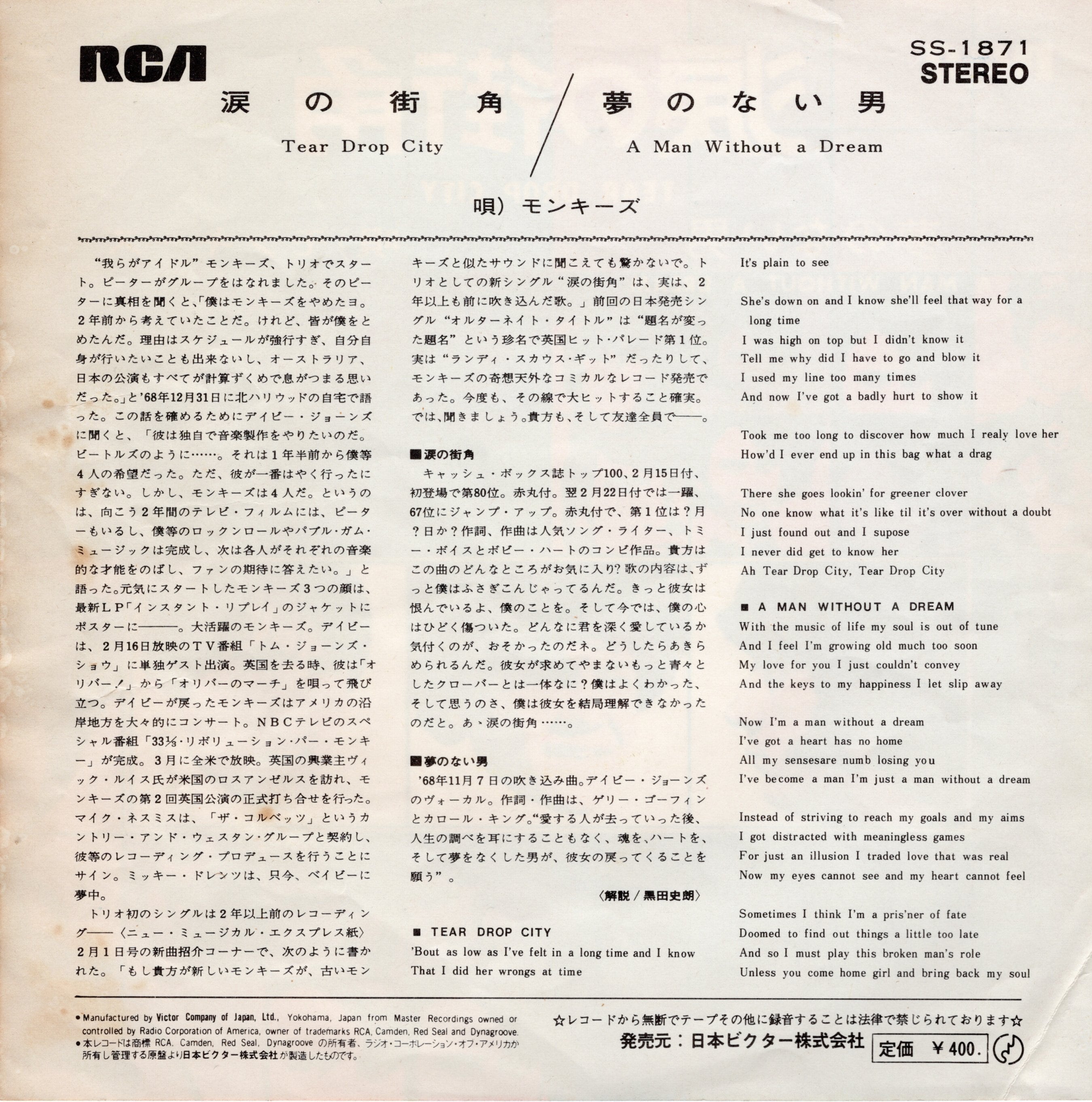 【7″】モンキーズ 涙の街角 / 夢のない男 THE MONKEES - TEAR DROP CITY / A MAN WITHOUT A DREAM