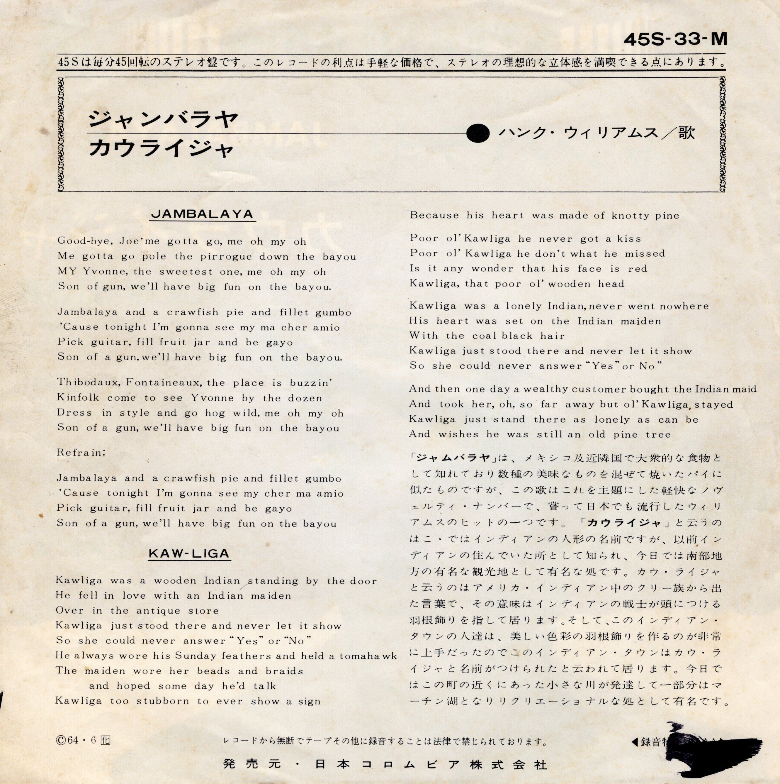 【7″】ハンク・ウィリアムス ジャンバラヤ / カウライジャ Hank Williams – Jambalaya (On The Bayou) / Kaw-Liga
