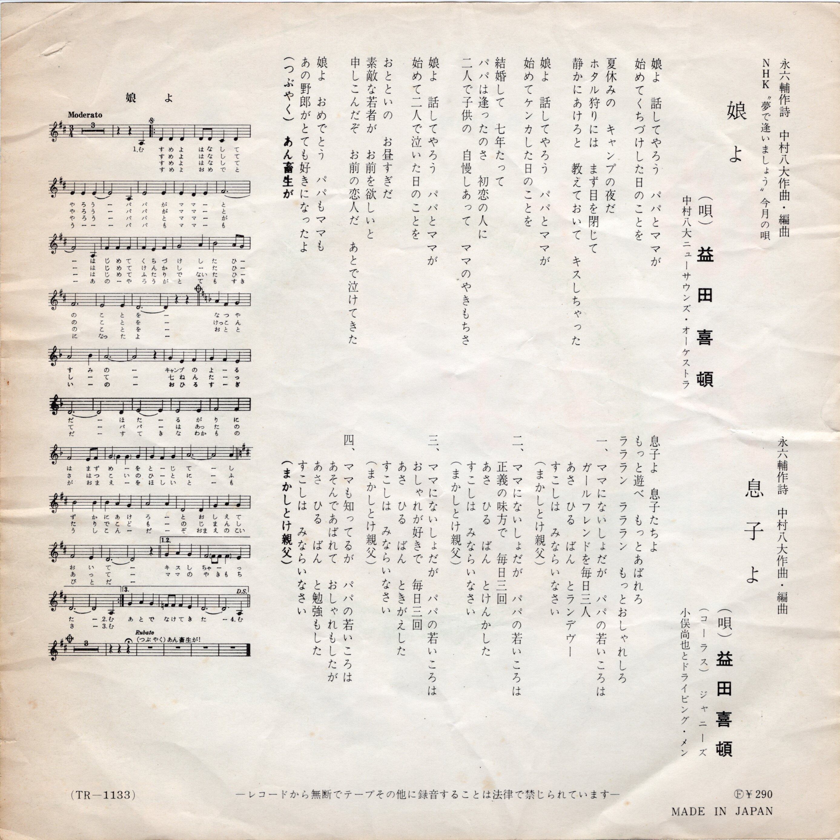娘への想いを綴ったメランコリック・バラード「娘よ」に息子役のジャニーズとの掛け合いが楽しい溌剌スウィンギン歌謡「息子よ」をカップリング。両面共に永六輔作詞/中村八大作・編曲。