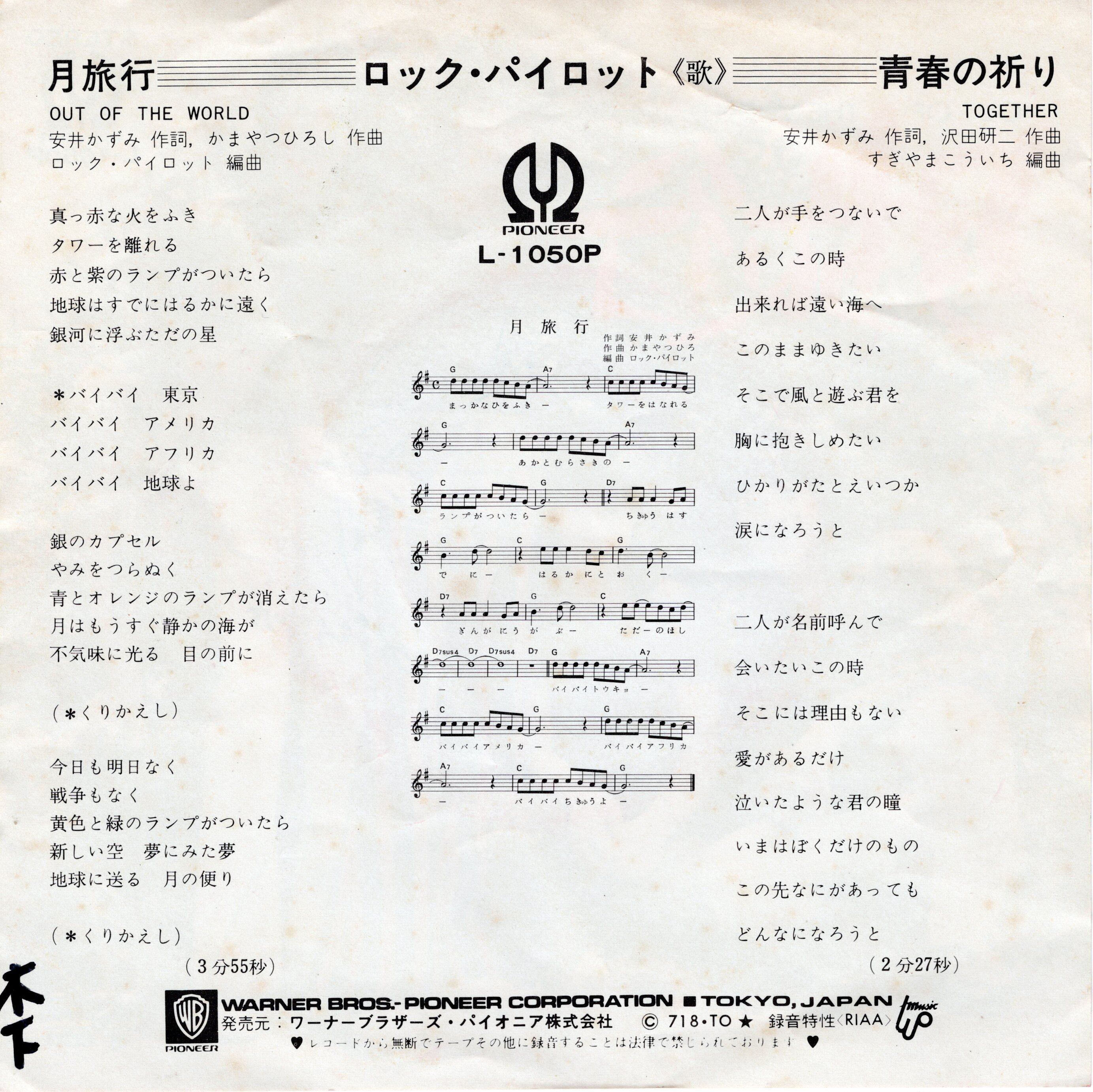 ’71年発売。元ピーターズ、元フラワーズ、元P.S.ヴィーナスのメンバーで結成されたロック・パイロットの3rdシングル。かまやつひろし作曲「月旅行」に沢田研二作曲「青春の祈り」をカップリング。