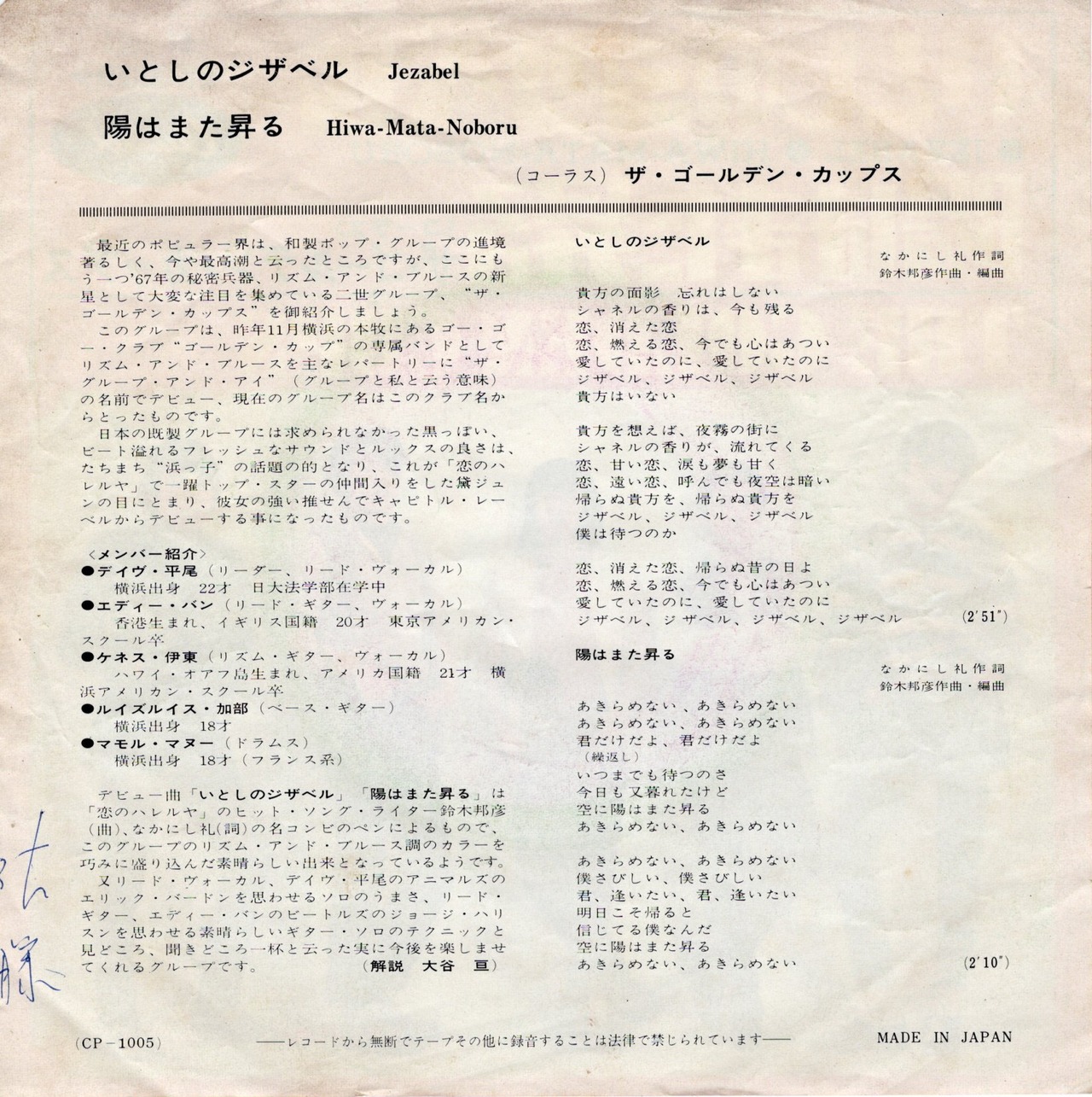 【7″/赤盤】ザ・ゴールデン・カップス いとしのジザベル / 陽はまた昇る