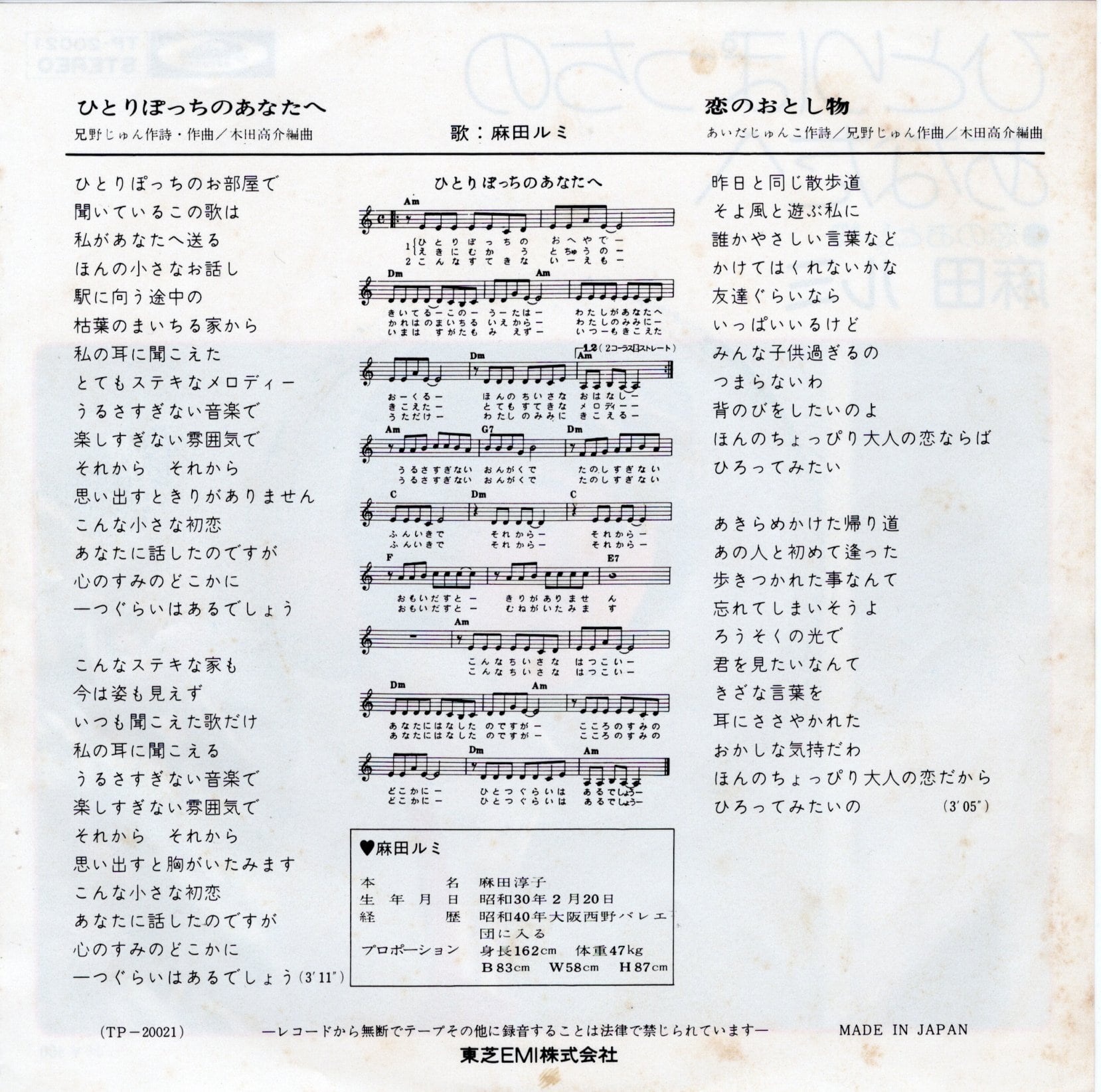 大阪府八尾市出身。歌手~俳優。麻田ルミ東芝EMI移籍第一弾シングル。両面共にアレンジは木田高介(元ジャックス)が担当。B面「恋のおとし物」がパーカッシブなソフトロック歌謡。