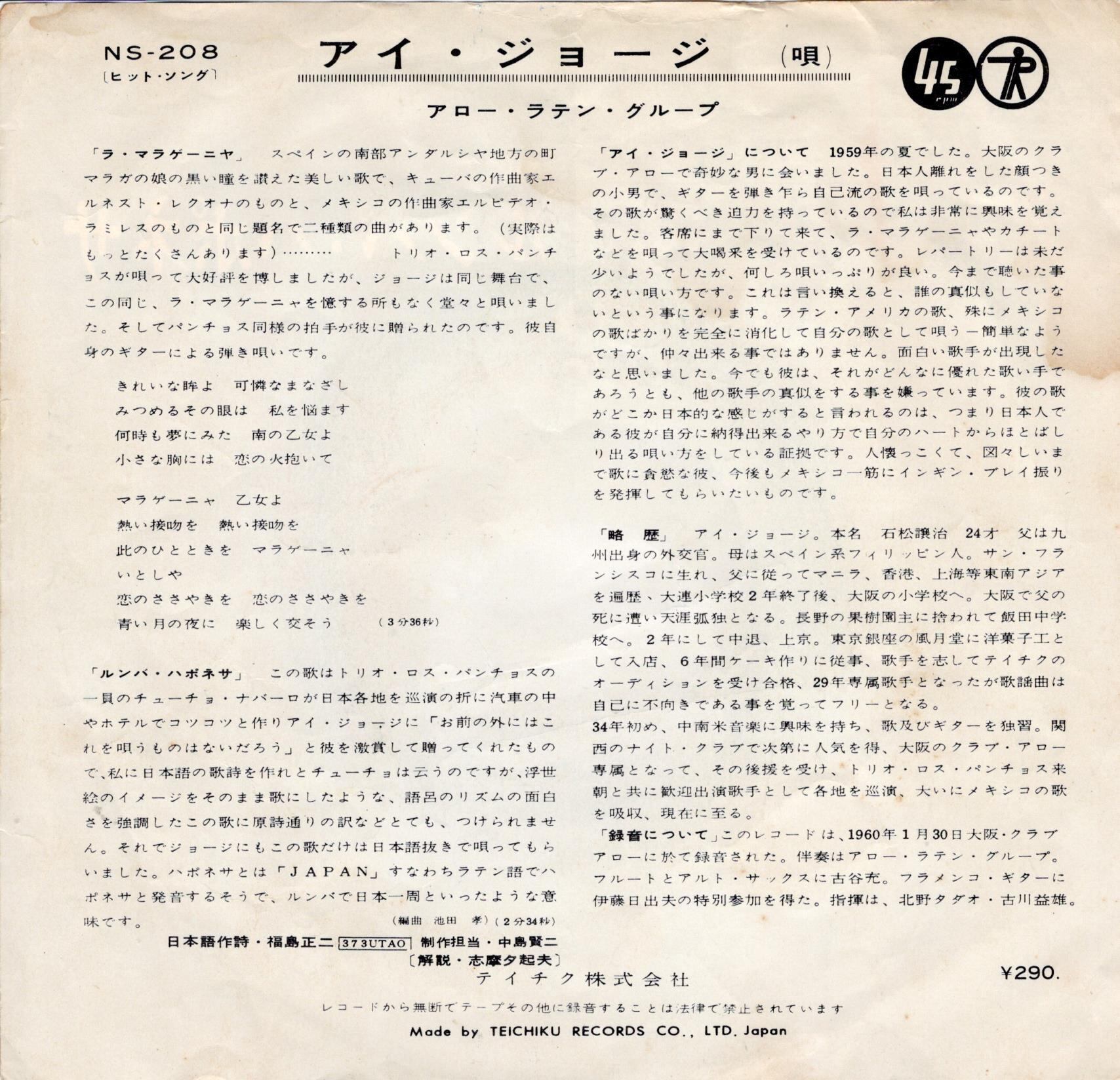 '60年発売。「黒田春雄」から改名したアイ・ジョージの再デビュー・シングル。B面はトリオ・ロス・パンチョスのチューチョ・ナヴァロが日本を題材に作ったご機嫌なラテン・ナンバー。題名の「ルンバ・ハポネサ」とは「ルンバで日本一周」的な意味だそうな。