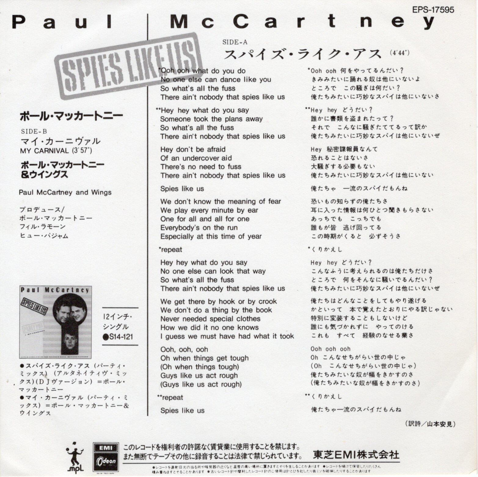’85年リリース。ワーナー映画「スパイズ・ライク・アス」主題歌。B面はポール・マッカートニー&ウイングス未発表曲でアルバム『ヴィーナス・アンド・マース』(1975年)のために行われたニューオーリンズでのレコーディングからのアウトテイク。