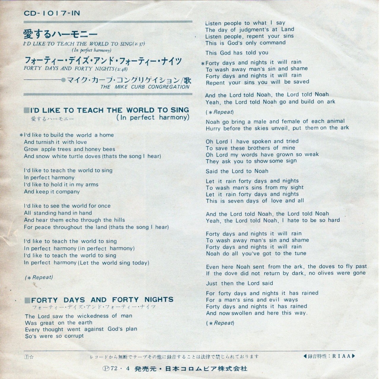 【7″】マイク・カーブ・コングリゲイション 愛するハーモニー / フォーティー・デイズ・アンド・フォーティー・ナイツ THE MIKE CURB CONGREGATION - I'D LIKE TO TEACH THE WORLD TO SING (In perfect harmony) / FORTY DAYS AND FORTY NIGHTS