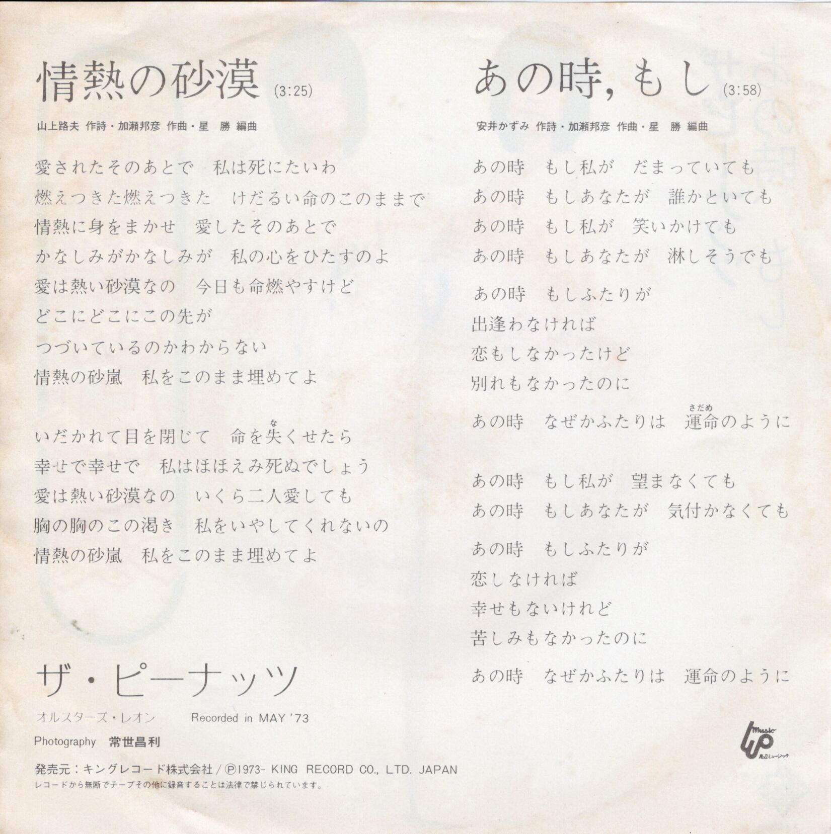 ’73年発売ザ・ピーナッツのラスト・アルバム「情熱の砂漠~ジャスト・ナウ・ザ・ピーナッツ」からの7inchカット。A面の加瀬邦彦作「情熱の砂漠」はファンキーなクラビネットとギター・カッティングが絡むソウル歌謡。近田春夫&ハルヲフォンをはじめ中国・台湾・香港・シンガポール・マレーシアの歌手にもカバーされる人気ナンバーです。B面も加瀬邦彦作品でベースが印象的なソウル・バラード。両面共アレンジはモップス在籍中の星勝によるもの。