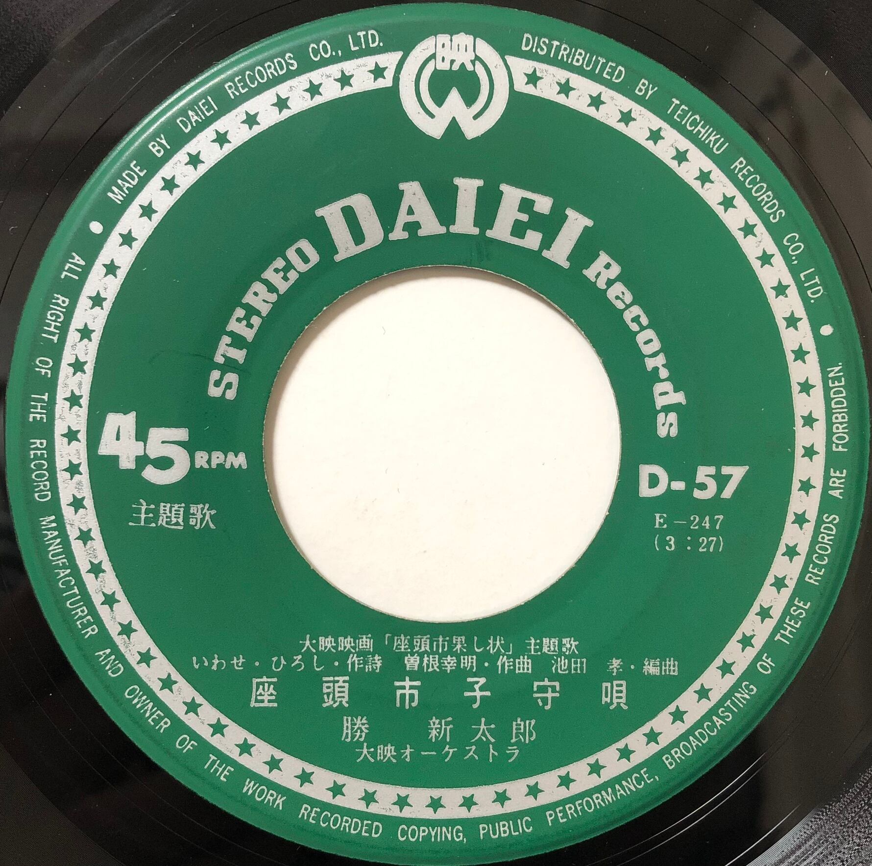 ’68年リリース。大映映画『座頭市果し状』主題歌「座頭市子守唄」(A面)に勝新の生き様そのものの歌詞とビッグバンド・ジャズ・サウンドが豪快に轟く「どんとやれ」をカップリング。