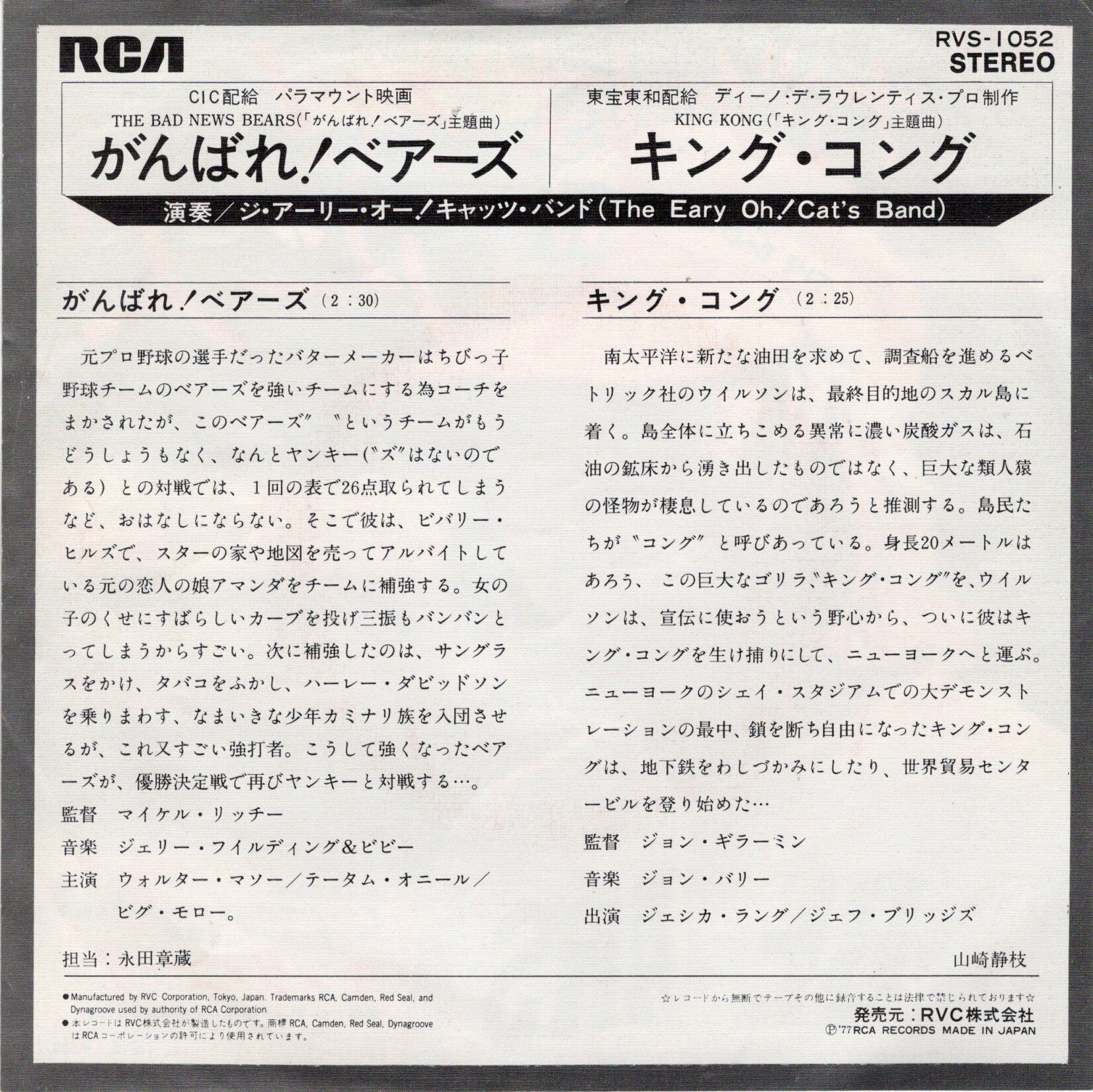 ビゼー「闘牛士」をラテン・ディスコにアレンジした「がんばれ!ベアーズ」に(怪音やSEをふんだんに散りばめた)不穏なジャングル・ビート「キング・コング」をカップリング。両面共にクラビネット入ってます。演奏のジ・アーリー・オー!キャッツ・バンドって何者?